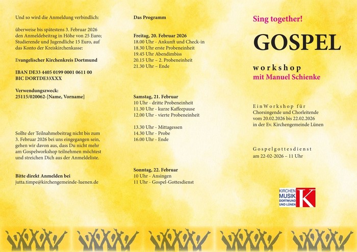 Sollte der Teilnahmebeitrag nicht bis zum 03. Februar 2026 bei uns eingegangen sein, gehen wir davon aus, dass Du nicht mehr am Gospelworkshop teilnehmen möchtest und streichen Dich aus der Anmeldeliste.