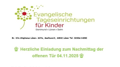 Herzliche Einladung zum Nachmittag der offenen Tür am 04.11.2025 von 16.00 - 17.30 Uhr in der Ev. Kita Stephanus Lünen-Mitte, Seelhuve 13, 44532 Lünen, Tel.: 02306-14050.