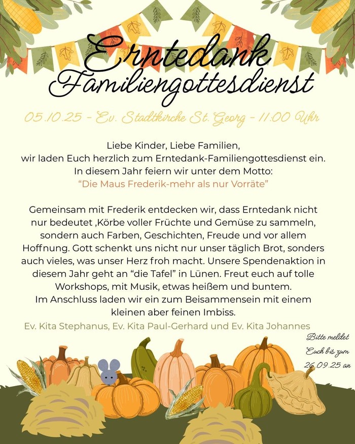 Gemeinsam mit Frederik entdecken wir, dass Erntedank nicht nur bedeutet, Körbe voller Früchte und Gemüse zu sammeln, sondern auch Farben, Geschichten, Freude und vor allem Hoffnung. Gott schenkt uns nicht nur unser täglich Brot, sondern auch vieles, was unser Herz froh macht. Unsere Spendenaktion in diesem Jahr geht an "die Tafel" in Lünen. Freut euch auf tolle Workshops, mit Musik, etwas heißem und buntem.