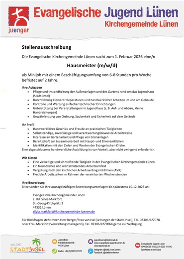 Stellenanzeige - Hausmeister (m/w/d) - Evangelische Jugend Lünen